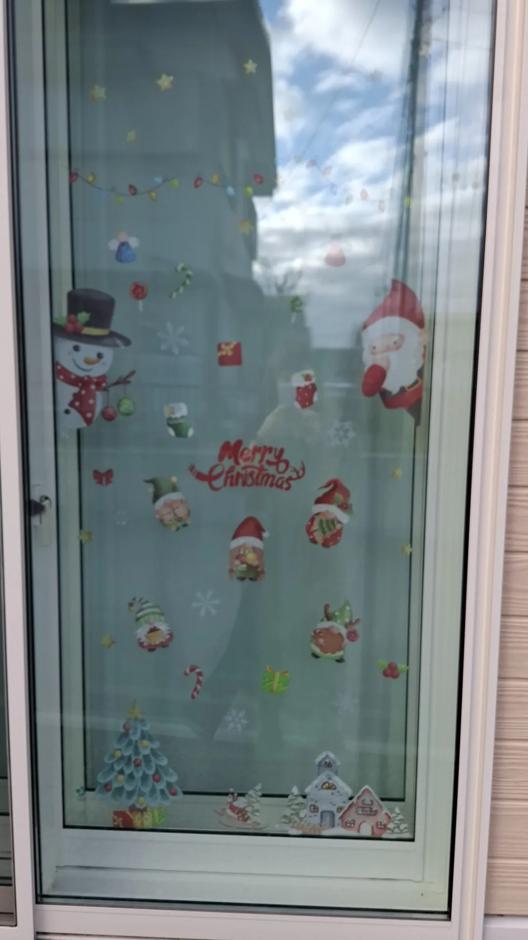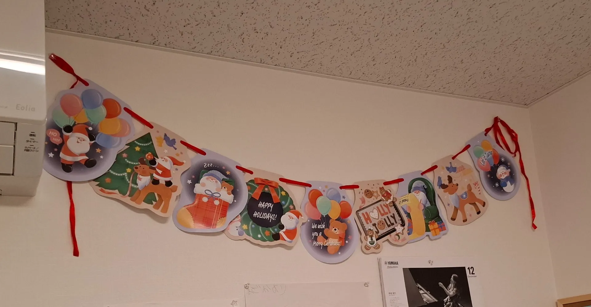 教室の中、道路側の窓にクリスマスの装飾をしました🎄